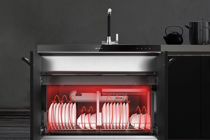 下層“干”區(qū)域為烘干+儲物功能,為餐具提供一個潔凈干爽的儲存環(huán)境,并有效預(yù)防細(xì)菌滋生,適于長久儲存碗碟。