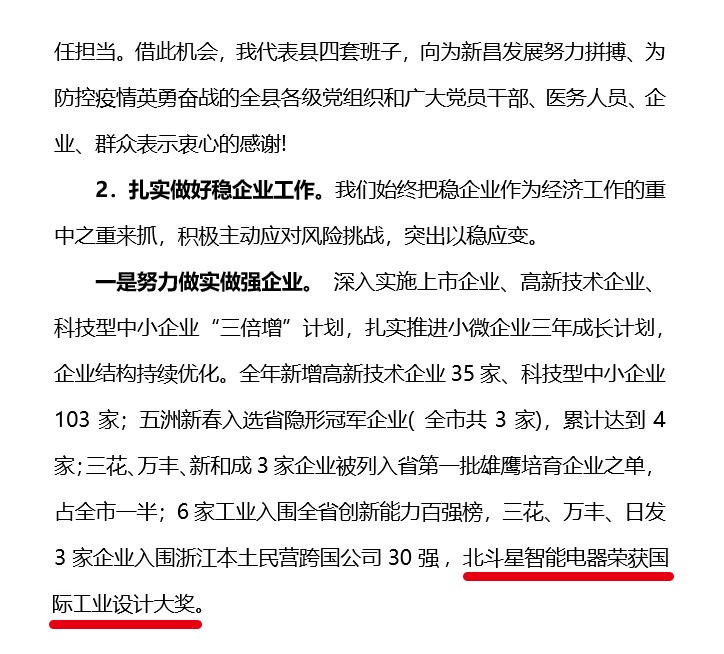 在大會(huì)上,新昌縣委書(shū)記李寧還點(diǎn)名表?yè)P(yáng)了北斗星智能電器榮獲國(guó)際工業(yè)設(shè)計(jì)大獎(jiǎng)。