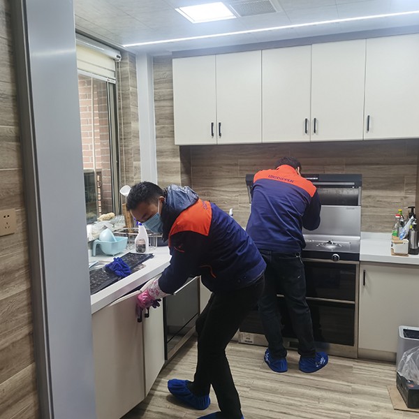 圖二—圖三:兩位服務(wù)小哥非常認(rèn)真的清潔集成灶,里里外外的,用各種清潔工具進(jìn)行清潔。