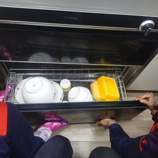 圖六:兩位服務(wù)小哥正在對(duì)消毒柜進(jìn)行清潔,裝的的碗有點(diǎn)多,他們清理的時(shí)候辛苦了。
