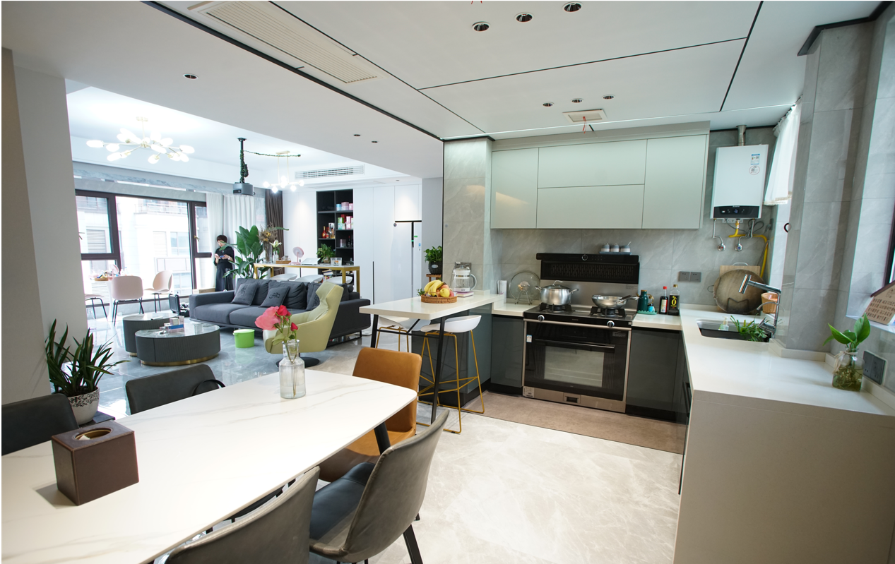 易女士家是開放式廚房,進入家門第一眼看到的就是客廳和廚餐廳,整個空間是一體的。易女士說,“集成灶離餐桌1米左右,平時一家人坐在餐桌上吃飯,邊爆炒邊吃飯,一點油煙味兒都聞不到。”