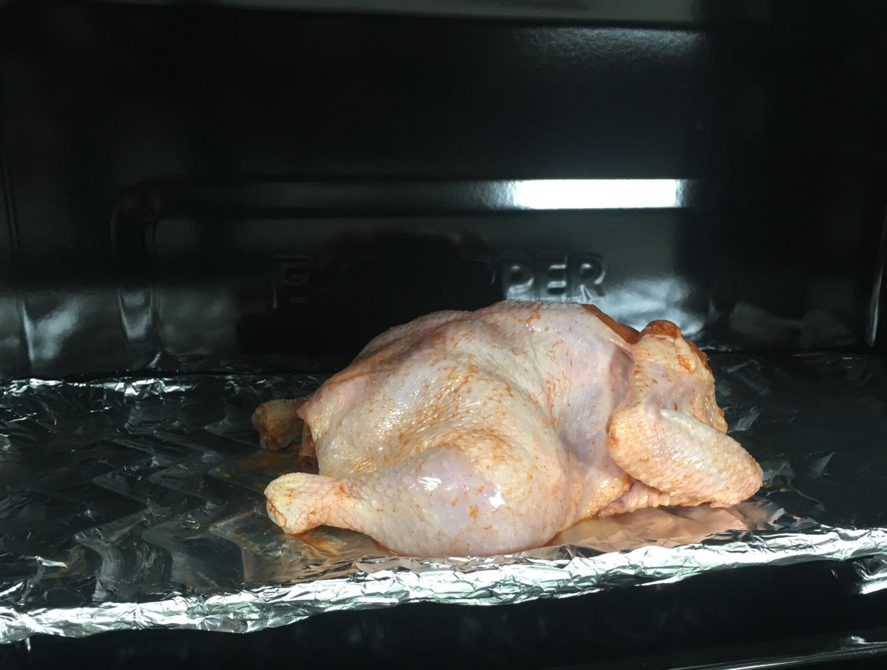 5. 打開北斗星蒸烤一體集成灶,選擇烤,調至濕烤模式,165度55分鐘,預熱后把雞放入,雞胸朝下即可;