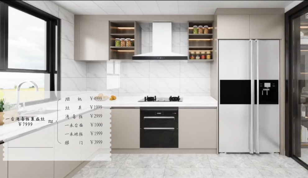 2、更省錢:一臺集成灶=煙機4999元+灶具1999元+消毒柜2999元(也可選擇蒸烤箱/空氣炸一體)+一米臺面1000元+一米地柜1999元+省去移門3999元+省去隔斷2999元,輕松省下近萬元。